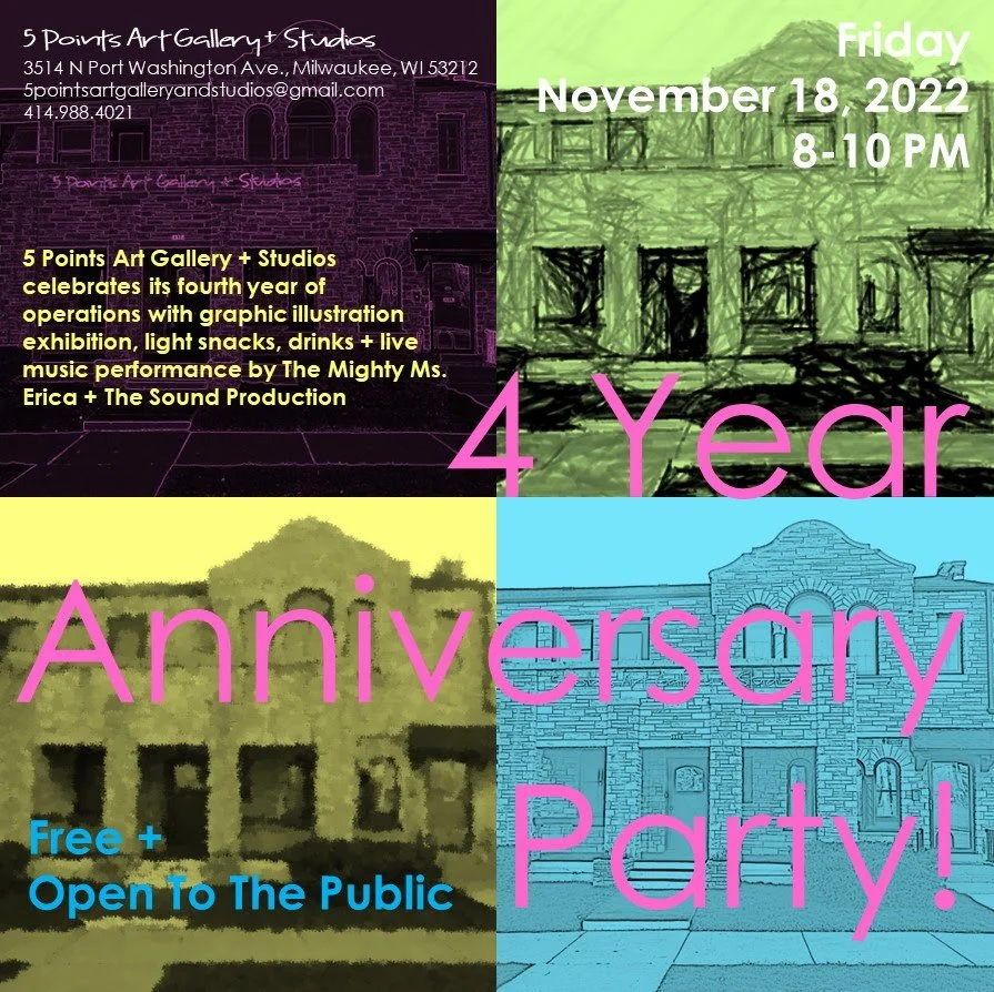 5 Points Art Gallery + Studios celebrates its fourth year of operations with a graphic illustration exhibition, light snacks, drinks, and live music performance by The Might Ms. Erica + The Sound Production.