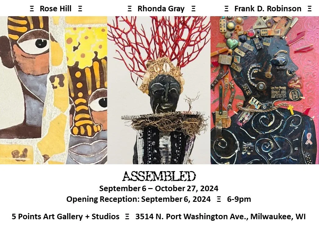 The process of stacking, layering, and putting pieces together transfers into the group exhibition, Assembled. Featuring three artists— Frank D. Robinson, Rhonda Gray, and Rose Hill— Assembled plays on assembly, reassembly, assemblage, and the transcension of singular and multiple objects’ original form and purpose within the artists distinct artistic approaches. Robinson’s logo-laden assemblage and figurative portraits, Gray’s shell, beaded, and accoutrement- embellished sculptures, and Hill’s meticulously mended fractured clay pictorial tablet interplay to create a dynamic and diverse dialogue on construction and new narration.